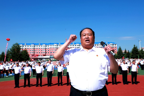 青年黨員母立巖手舉黨旗健步跑向藍(lán)莓廣場主席臺,把黨旗交到了林業(yè)局黨委書記胡守慶手中,胡守慶揮舞黨旗,臺下黨員齊聲說道:“不忘初心、牢記使命”。