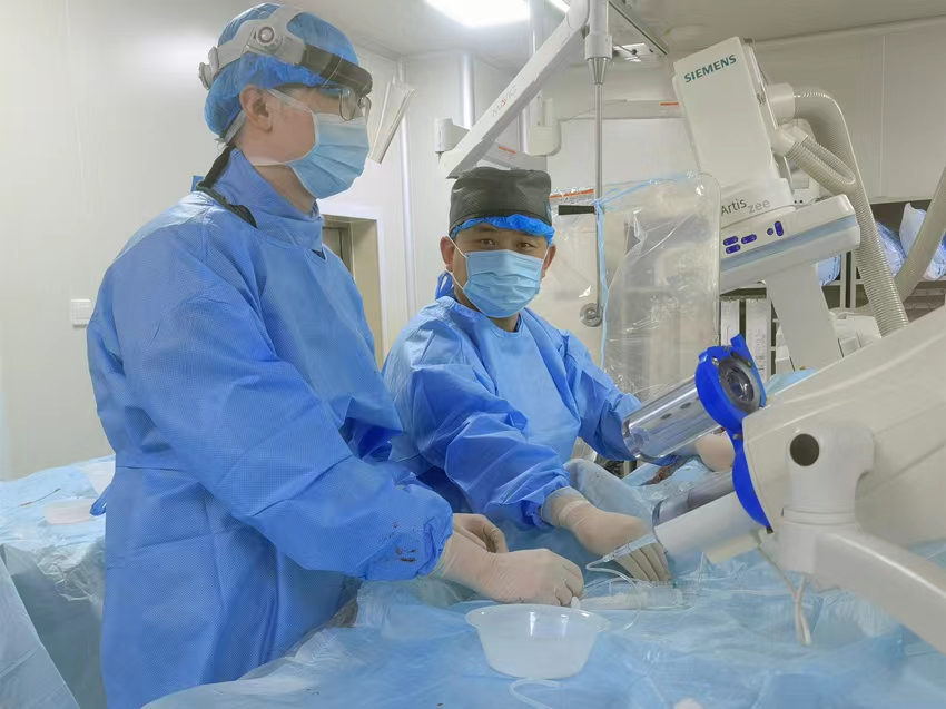 “患者入院后雖進(jìn)行了快速靜脈溶栓,但病情依然進(jìn)展性加重,我們發(fā)現(xiàn)患者病情為顱內(nèi)主干血管閉塞導(dǎo)致,情況十分危急,如果不及時介入開通閉塞的顱內(nèi)大血管,一旦錯過治療最佳時機(jī),患者就可能會出現(xiàn)危及性命等情況?!泵F副主任醫(yī)師回憶了當(dāng)時搶救情景。搶救刻不容緩,在爭得家屬同意并簽字后,神經(jīng)介入團(tuán)隊(duì)立即將張先生送至導(dǎo)管室進(jìn)行介入取栓治療。