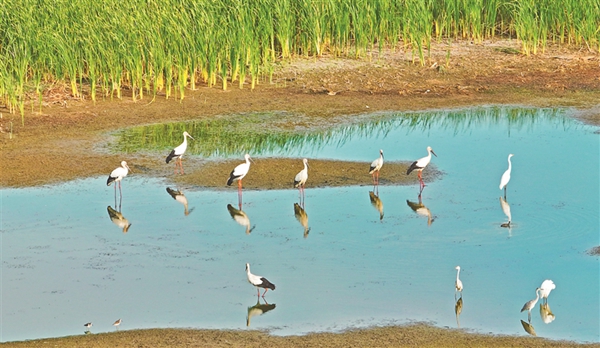 “此次現(xiàn)身的東方白鸛數(shù)量有近百只,且已在濕地停留10余日。以往東方白鸛只有在春秋遷徙季節(jié)才經(jīng)停安邦河濕地,在這個季節(jié)現(xiàn)身,屬史上首次?!卑舶詈訚竦刈匀槐Wo(hù)區(qū)管理局旅游科科長王偉介紹。