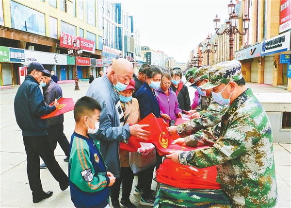 在伊美區(qū)步行街活動(dòng)現(xiàn)場(chǎng),市人防辦工作人員向市民發(fā)放宣傳單和宣傳手冊(cè)(郭強(qiáng)/攝)。