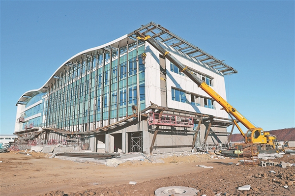 臨近立冬,黑河市氣溫已降至零下。在黑河市愛輝區(qū)上馬場鎮(zhèn),黑河寒區(qū)試車高新技術(shù)產(chǎn)業(yè)園項目仍在緊張建設(shè)。起重機(jī)吊起外墻造型鋼架,工人們在腳手架上拿著焊槍緊張作業(yè)。