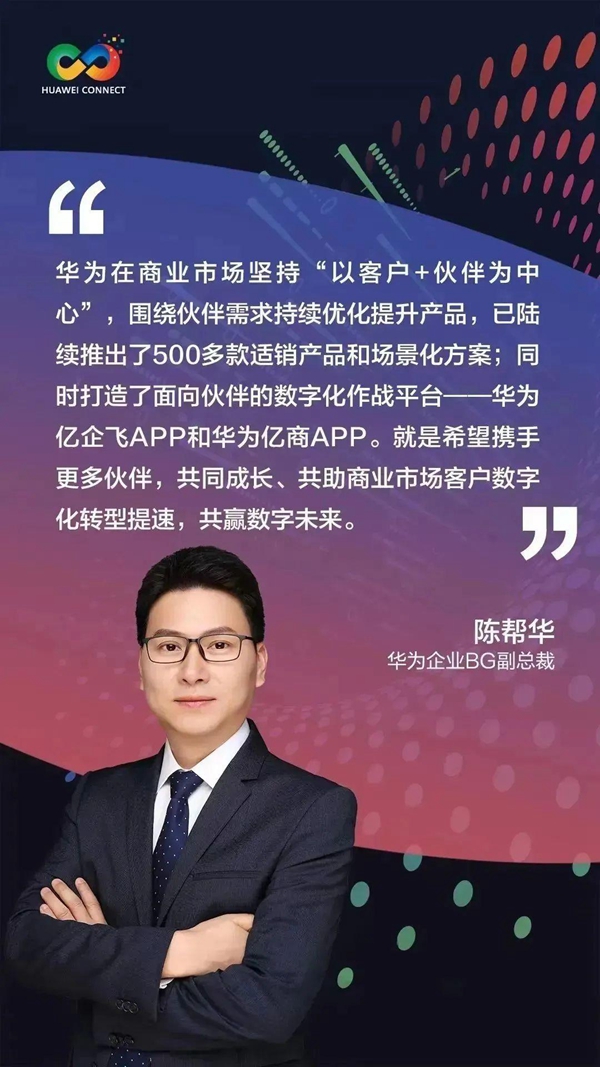 對(duì)此,陳幫華表示,華為在商業(yè)市場(chǎng)堅(jiān)持“以客戶+伙伴為中心”,圍繞伙伴需求持續(xù)優(yōu)化提升產(chǎn)品,已陸續(xù)推出了500多款適銷產(chǎn)品和場(chǎng)景化方案;同時(shí)打造了面向伙伴的數(shù)字化作戰(zhàn)平臺(tái)——華為億企飛APP和華為億商APP。就是希望攜手更多伙伴,共同成長(zhǎng)、共助商業(yè)市場(chǎng)客戶數(shù)字化轉(zhuǎn)型提速,共贏數(shù)字未來(lái)。
