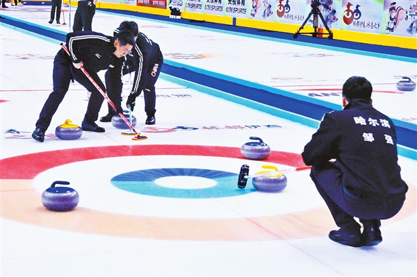圖為男子冰壺哈爾濱隊(duì)比賽現(xiàn)場。(胡錫韋/攝)