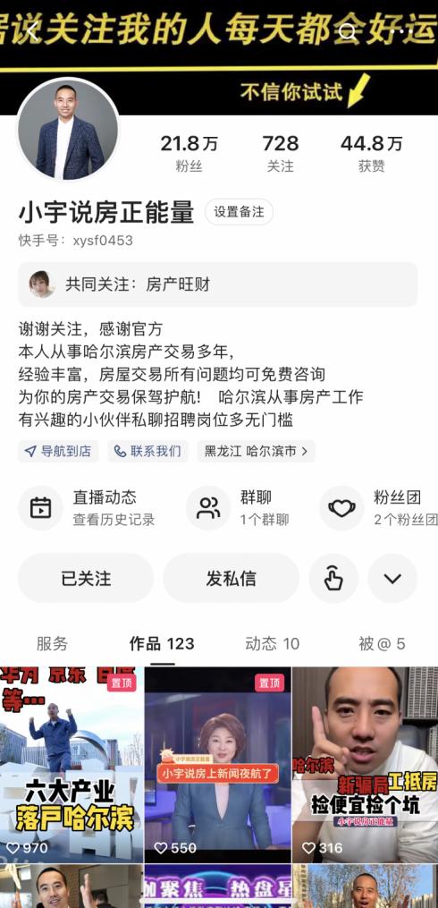 “松北這個(gè)小區(qū),現(xiàn)房7000起步”、“這里是江南核心商業(yè)圈,通勤便利”、“這可以說(shuō)是哈爾濱二環(huán)旁配套設(shè)施最全的樓盤(pán)”……晚上8點(diǎn),每當(dāng)夜幕降臨,房產(chǎn)主播小宇(快手ID:xysf0453)會(huì)準(zhǔn)時(shí)出現(xiàn)在快手平臺(tái)直播間,為廣大有購(gòu)房需求的客戶答疑解惑。