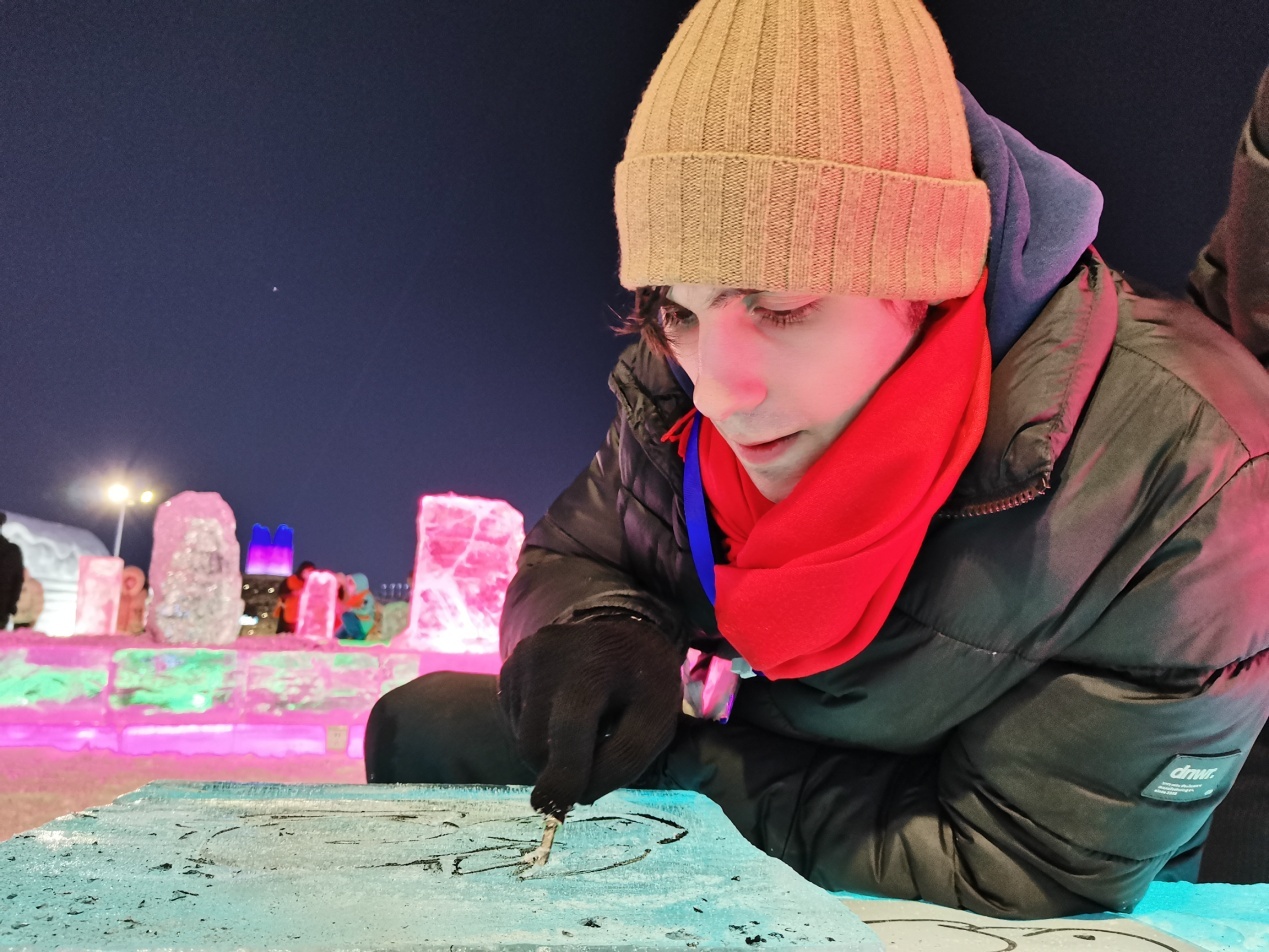 傍晚,中外青少年在流光溢彩、美輪美奐的哈爾濱冰雪大世界中感知冰雪藝術(shù)的魅力。在冰雪藝術(shù)體驗(yàn)營聆聽冰雕制作過程,學(xué)習(xí)將冰與中國傳統(tǒng)木刻版畫相結(jié)合,親手設(shè)計(jì)制作屬于自己獨(dú)一無二的冰版畫,體驗(yàn)冰雪帶來的樂趣。
