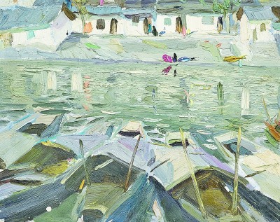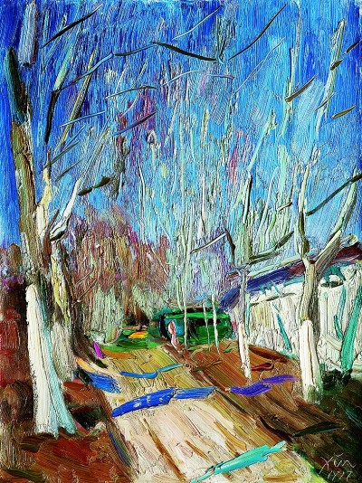 在諶北新的代表性作品里,無論何種結(jié)構(gòu),色調(diào)、筆觸、造型、線條都可以獨(dú)立觀賞。一塊厚堆的白色顏料,可以是云朵、是白墻,或是前后重疊的船帆。用筆的疏密、狀貌和節(jié)奏都有獨(dú)立存在的意義,既可以像欣賞書法用筆一樣拋開物象去體味,又可以去想象和填補(bǔ)與之恰合的物象和自然關(guān)系。諶北新對書法的深入研究和長期的繪畫寫生,以及他對物象、空間、色彩關(guān)系的觀察與創(chuàng)造實(shí)踐,使其作品能夠?qū)⒉煌谋憩F(xiàn)手法有機(jī)地融為一體。比如一筆畫下去,既表現(xiàn)空間層次,也體現(xiàn)厚薄輕重,同時(shí)展現(xiàn)光線的微妙變化。這種綜合性的呈現(xiàn)效果,實(shí)際上也契合著中國山水畫所追求的通過用筆的輕重緩急,通過虛實(shí)濃淡的墨色渲染,通過遠(yuǎn)近高低的畫面布局,表現(xiàn)山水對人的情感與心靈的影響。而諶北新的風(fēng)景油畫,正是基于中國人對山川草木的喜愛之情,通過體察和探求提煉出的獨(dú)特意象,它符合現(xiàn)代人的心理需求,也呼應(yīng)著畫家畢生追求的藝術(shù)境界——須其自來,不以力構(gòu)。