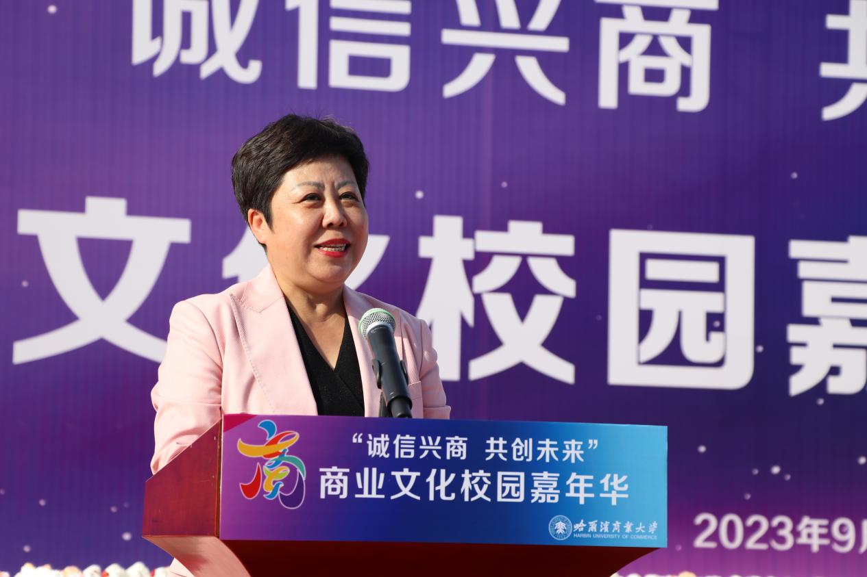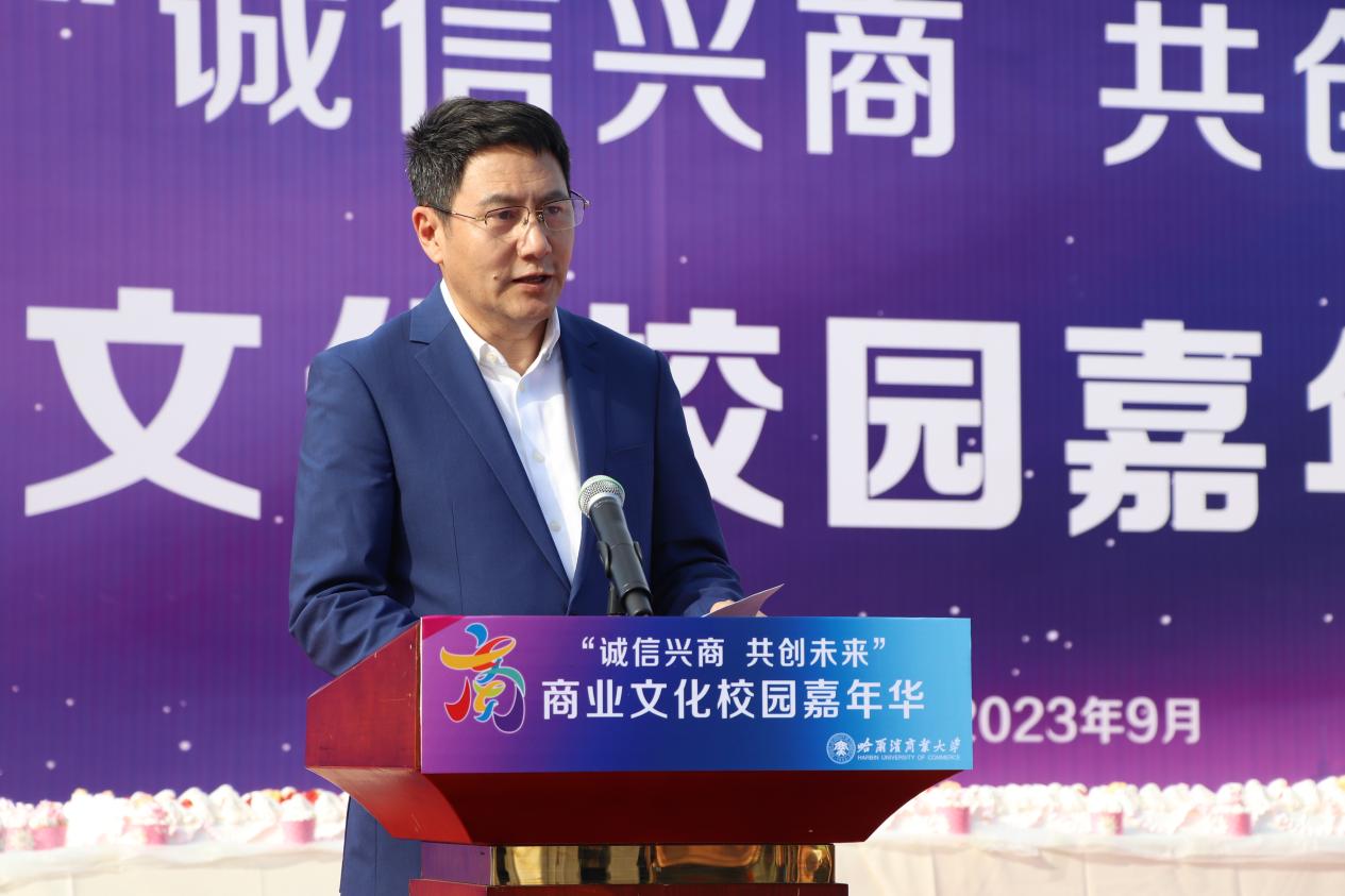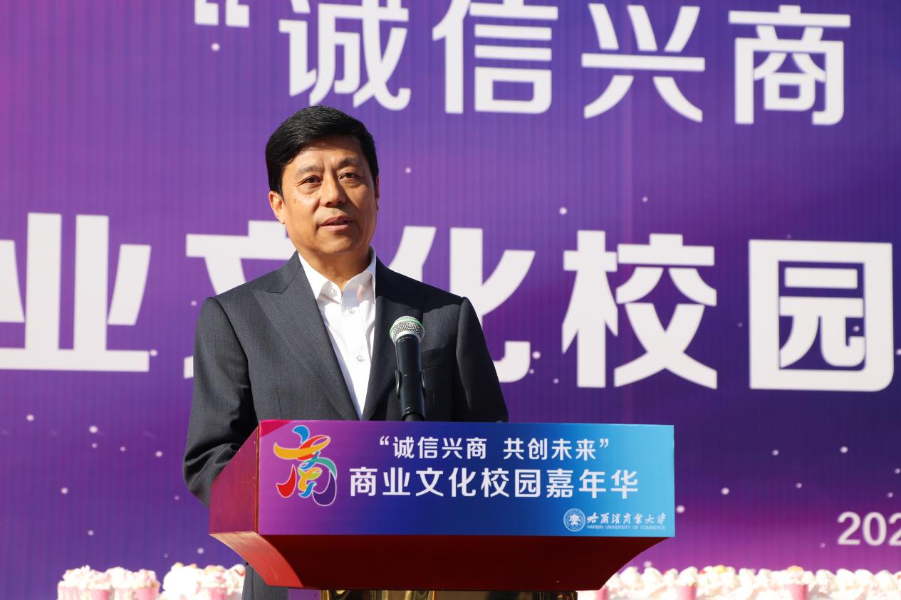 哈爾濱商業(yè)大學(xué)黨委書記孫先民致辭。他表示,誠(chéng)信“軟實(shí)力”為高質(zhì)量發(fā)展提供“硬支撐”。本屆“誠(chéng)信興商·共創(chuàng)未來”商業(yè)文化校園嘉年華活動(dòng)堅(jiān)持以文化力量啟智潤(rùn)心、固本培元,是深入學(xué)習(xí)貫徹習(xí)近平總書記在主持召開新時(shí)代推動(dòng)?xùn)|北全面振興座談會(huì)和視察我省時(shí)的重要講話重要指示精神,全面落實(shí)立德樹人根本任務(wù)的務(wù)實(shí)舉措。哈爾濱商業(yè)大學(xué)作為新中國(guó)第一所多科性商業(yè)大學(xué),始終堅(jiān)持“大商鑄才、大雅育人、商雅兼?zhèn)?、?jīng)世濟(jì)民”的育人理念,厚植師生“心懷祖國(guó),至誠(chéng)奉獻(xiàn),以商弘業(yè),矢志一流”的大商之道?;顒?dòng)將充分發(fā)揮老字號(hào)在文化引領(lǐng)、品牌建設(shè)、產(chǎn)業(yè)升級(jí)等方面的示范引領(lǐng)作用,彰顯龍江市場(chǎng)主體活力與創(chuàng)新力,聚焦建設(shè)“六個(gè)龍江”、推進(jìn)“八個(gè)振興”,筑牢堅(jiān)定龍江文化繁榮發(fā)展的自信根基,進(jìn)一步凝聚師生扎根龍江、服務(wù)龍江、建設(shè)龍江的情懷和力量。