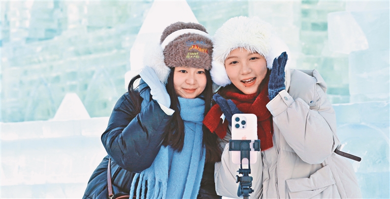 冰雪大世界游人如織,每處冰景前都有拍照留念的游客。 本報(bào)記者 蔣國(guó)紅 張澍攝