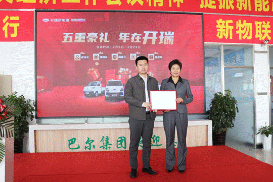 開(kāi)瑞新能源汽車(chē)有限公司北部戰(zhàn)區(qū)總監(jiān)王培山向巴爾新能源總經(jīng)理徐娟頒發(fā)省總代理授權(quán)書(shū)