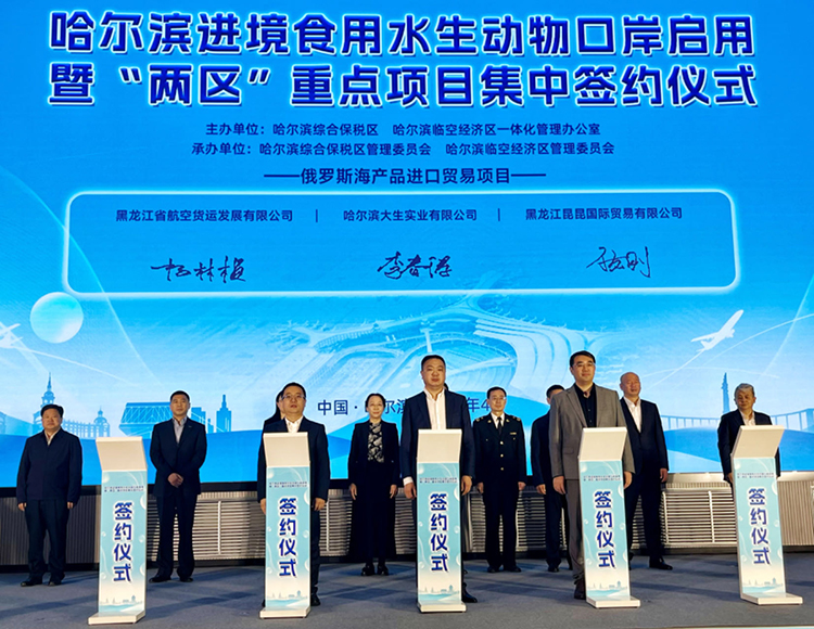 同日,哈爾濱進(jìn)境食用水生動物口岸啟用暨“兩區(qū)”重點(diǎn)項目集中簽約儀式在哈爾濱臨空經(jīng)濟(jì)區(qū)舉行?!皟蓞^(qū)”一體化辦公室主任介紹了哈爾濱進(jìn)境食用水生動物指定監(jiān)管場地和保稅航油項目基本情況。