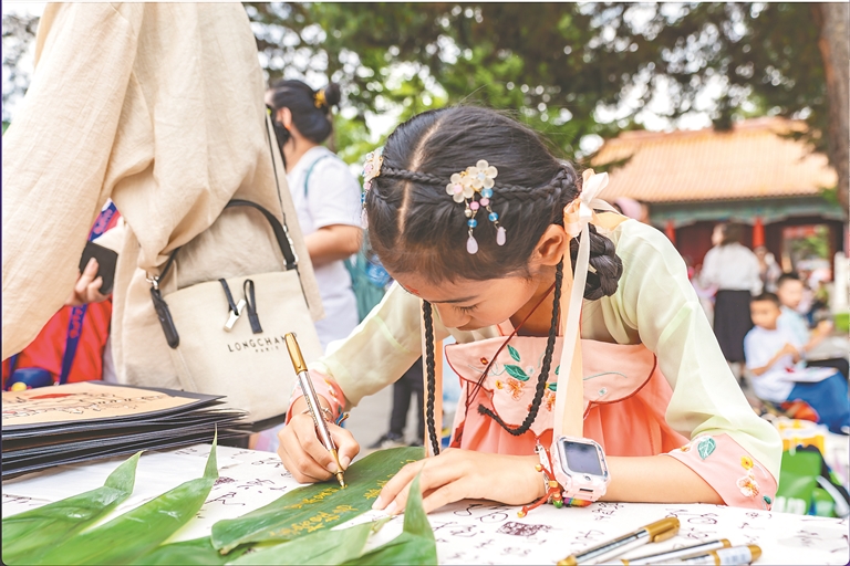 本報(bào)10日訊(記者 董云平)對(duì)古詩(shī)摘“高粽”香囊、體驗(yàn)古風(fēng)花鈿、沐蘭湯凈手、粽葉寫(xiě)祝福、解鎖端午限量印章、領(lǐng)取端午彩絲……10日,省民族博物館融合傳統(tǒng)習(xí)俗與現(xiàn)代創(chuàng)意,開(kāi)啟沉浸式“端午文廟行:粽情畫(huà)意 古韻新體驗(yàn)”,多彩傳統(tǒng)民俗、非遺文化將活動(dòng)現(xiàn)場(chǎng)節(jié)日氛圍感拉滿,帶給大家端午出游“新”體驗(yàn)。