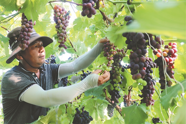 “春棚栽培的葡萄在8月中旬成熟,而在暖棚里,由于溫度、濕度得到科學(xué)精準(zhǔn)控制,葡萄成熟得更早,產(chǎn)量更高。7月10日左右即可上市,搶占市場空缺?!笔卟斯矩?fù)責(zé)人王軍強(qiáng)邊說一邊拿起手機(jī)拍攝,為一周后葡萄上市進(jìn)行宣傳。