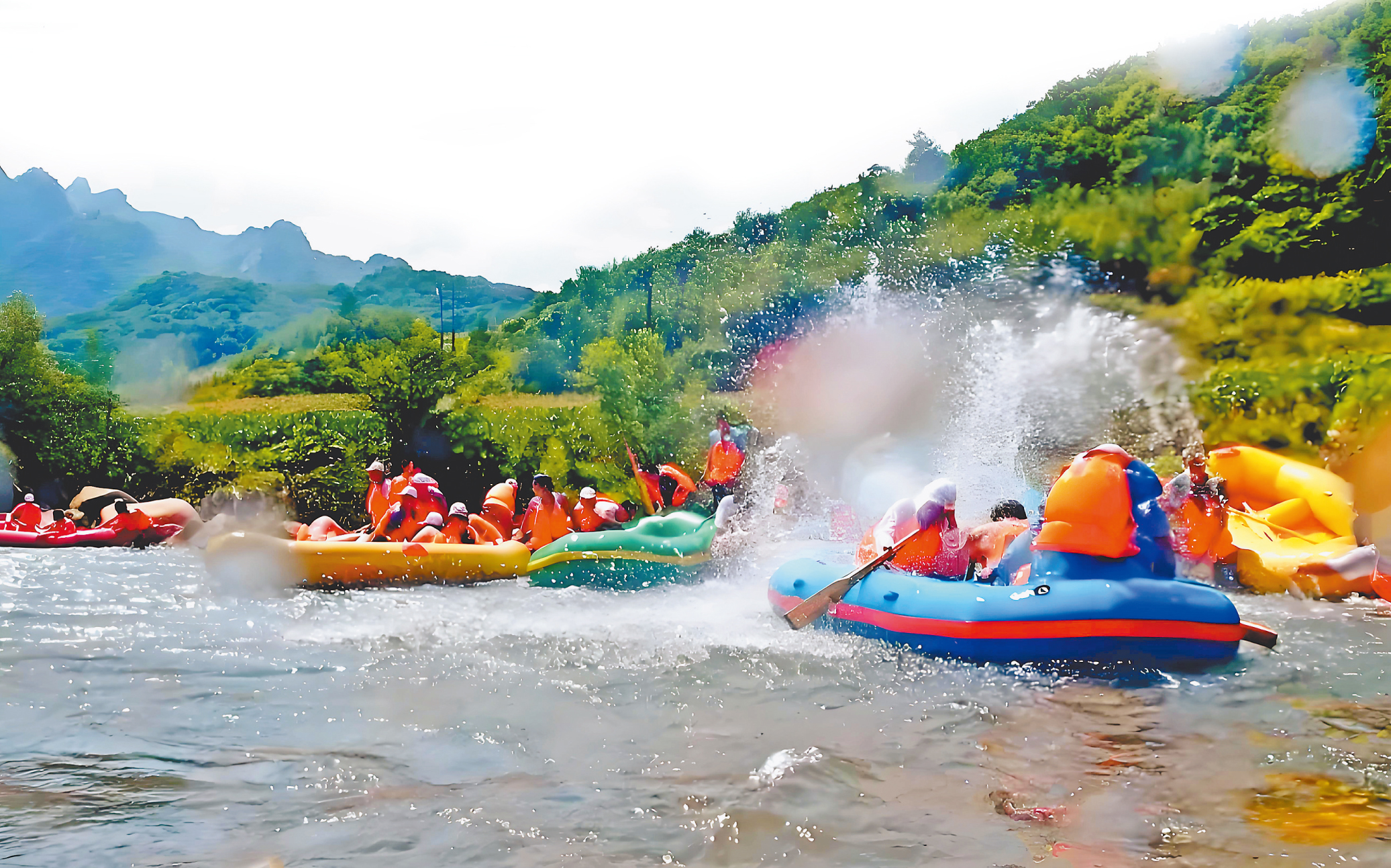 漂流起點(diǎn)龍珠湖畔山清水碧,景色宜人,1500米的人工水渠曲徑通幽,132米的彩色滑道讓人充分體驗(yàn)飛流直下的速度與激情。景區(qū)內(nèi)山清水秀,云霧蒸騰,水質(zhì)清冽甘甜。沿河兩岸風(fēng)景如畫,龍珠湖、佛手峰、駱駝峰等多處自然景觀令人目不暇接,讓游客切實(shí)感受到“兩岸青山走,人在畫中游”的美妙。