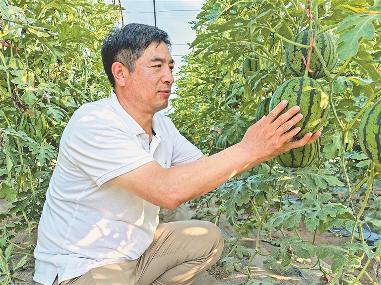 王喜慶在查看西瓜長勢(shì)。