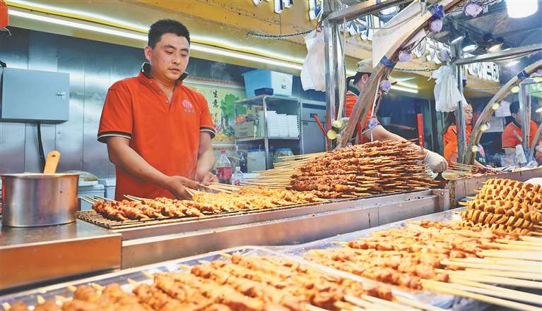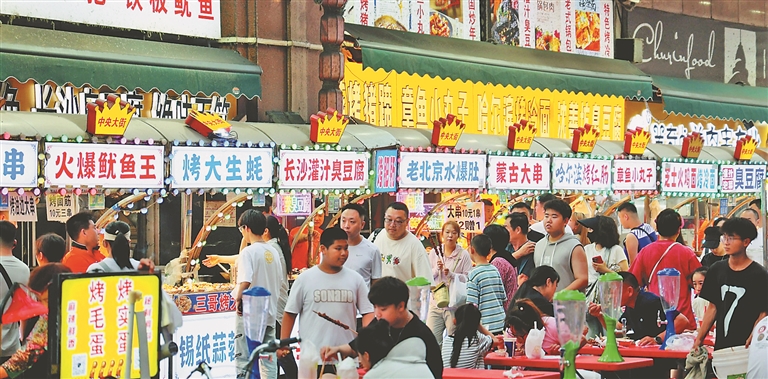 盛夏里,哈爾濱市中央大街的美食夜市燈火通明,人聲鼎沸,各種食物琳瑯滿目,空氣中彌漫著食物的香味。
