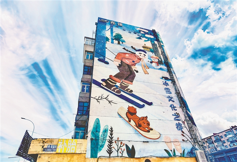 道外區(qū)火車(chē)頭街附近,一棟7層樓的外墻上繪制了滑雪運(yùn)動(dòng)的場(chǎng)景,吸引許多路人觀看;北馬路附近,一棟老樓的紅磚外墻也進(jìn)行了彩繪,巨大的圖畫(huà)為當(dāng)?shù)卦鎏砹艘坏烂谰啊?/span>本報(bào)記者 蘇強(qiáng)攝