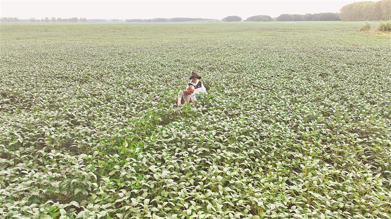 26日,在北大荒農(nóng)業(yè)股份二九〇分公司一片大豆田中,種植戶戎立國正在查看作物長勢。表面望去,這片田地與普通大豆無異,這里實(shí)際種植的,是特色黑豆品種。