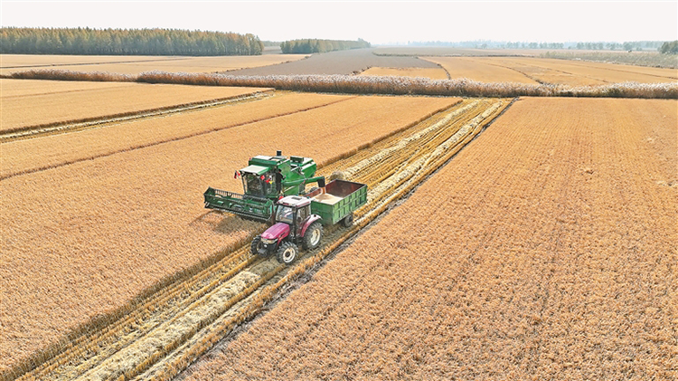 在同江城投現(xiàn)代農(nóng)業(yè)園區(qū)大豆收割現(xiàn)場(chǎng),收割機(jī)正開足馬力在田間來(lái)回穿梭,一排排大豆植株被卷入收割機(jī),金黃色的豆粒隨即被收入“囊”中。脫粒后,金黃色的豆粒通過(guò)收割機(jī)的出糧口落入運(yùn)輸車中,一派豐收的喜人景象。
