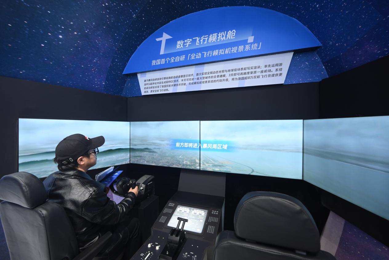 “只需要推動操縱桿,就能操作系統(tǒng),體驗民航飛行員第一視角下、擬真的訓練場景……”在展區(qū)前方,由南航自研虛像顯示技術和騰訊自研游戲引擎技術共同打造的全動飛行模擬機視景系統(tǒng),吸引眾多參觀者體驗?;隍v訊自研游戲引擎,系統(tǒng)首次實現(xiàn)全局動態(tài)光照與地球級場景超寫實渲染,多邊形生成面數(shù)較之前提升380倍、貼圖精細度提升100倍,助力實現(xiàn)我國民航關鍵技術突破。