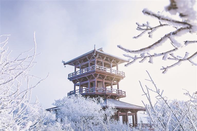 山林間云霧彌漫,白雪和蒼勁的虬枝映襯,山頂?shù)奶煊娱w和一個個白色巨人般的發(fā)電“風車”相映成趣,將這座名山裝扮得更加素雅、更顯活力。近處,松柏全都凝霜掛雪,戴銀披玉。山頂原始次森林中,低矮的灌木叢也被積雪覆蓋,成為了一朵朵五彩的冰花。高大的樹木被輕盈的雪花點綴,晶瑩剔透,仿若玉樹瓊枝,隨風搖擺,宛如仙境。
