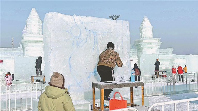 據了解,本屆冰雕比賽歷時3天,所有參賽作品將于1月4日雕刻結束,與游客見面。本報記者 馬智博攝