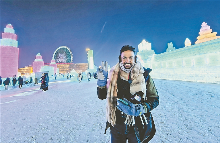 夜幕降臨,園區(qū)里五彩斑斕。徜徉其中,記者不時與遠道而來的國際友人擦肩而過。印度游客庫洲倫一路走走停停,仿佛一位尋寶者,在冰雪編織的夢幻王國中盡情探索。他胸前挎著一臺單反相機,手中握著手機,眼中閃爍著滿滿的驚奇。每一次駐足,每一次與冰雕雪塑的凝視,都伴隨著按下相機快門的聲響。