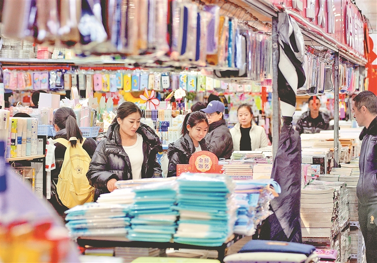 19日,哈爾濱市道里區(qū)一處大型批發(fā)市場,許多家長帶著孩子前來選購文具。