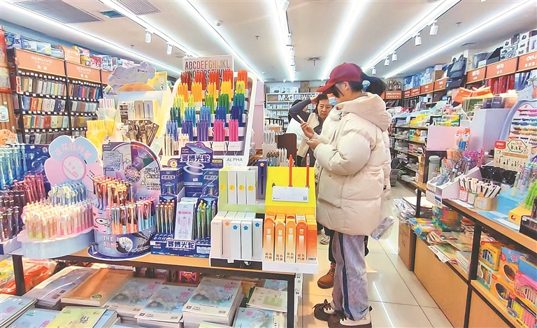 在文教用品專柜里,各種筆記本、款式新穎的筆、不同顏色的文具盒、書包等琳瑯滿目,應(yīng)有盡有。銷售人員介紹,新學(xué)期即將開始,文具的銷售量持續(xù)增多。家長為孩子挑選文具時,更傾向于選擇環(huán)保的產(chǎn)品。
