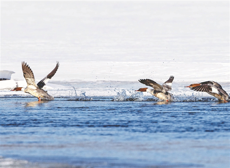 本報(bào)訊(黃曉光 記者郭俊峰)近日,國(guó)家一級(jí)保護(hù)動(dòng)物秋沙鴨翩然而至,為小興安嶺的初春增添了別樣生機(jī)。它們?cè)诔纬旱乃嫔嫌迫挥芜?,時(shí)而將頭扎進(jìn)水里,探尋著水下的美味;時(shí)而歡快地拍打著翅膀,濺起晶瑩的水花。