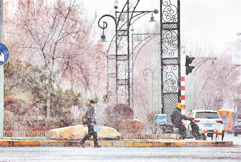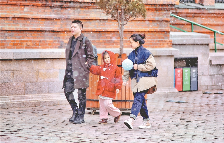 哈爾濱市的雪花落地后融化成水,未對道路交通造成影響。人們紛紛拿出手機拍攝精彩瞬間。