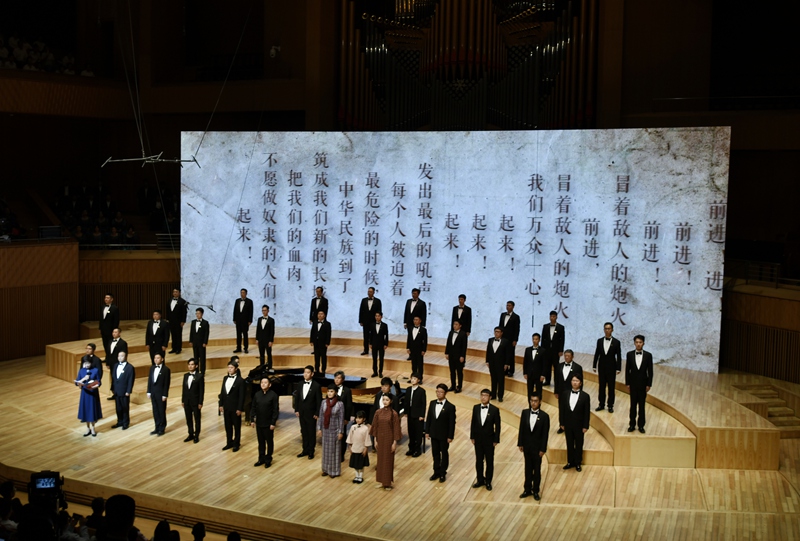 第一篇章《松花江上》以《長城謠》的泣血鄉(xiāng)愁與《義勇軍進行曲》的全場肅立高唱,訴盡抗戰(zhàn)時期的流亡之痛與民族豪情,更創(chuàng)新植入“童年、少女、青年”三代“蕭紅”扮演者(張舒涵、鄭楚琪、尤泓斐)與合唱團的情景互動。第二篇章《抗戰(zhàn)的烽火》中,《五月的鮮花》《露營之歌》《保衛(wèi)黃河》等作品以合唱與立體站位,緬懷趙一曼、楊靖宇等英烈,再現(xiàn)全民抗戰(zhàn)的壯闊圖景。第三篇章《文脈永續(xù)》則通過魯迅、茅盾等文學名家對蕭紅的評價、跨年代讀者代表致敬及《致祖國》的磅礴合唱,彰顯其文學精神在新時代的傳承。