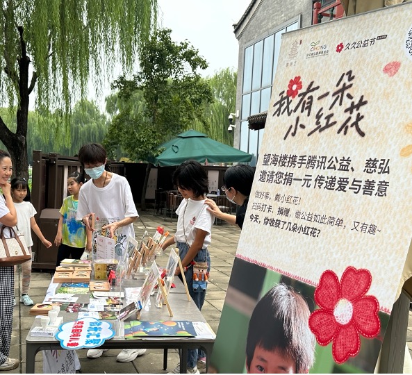 北京慈弘慈善基金會在后海望海樓舉辦“小紅花公益市集”,通過義賣來支持鄉(xiāng)村學校圖書角建設(shè),受到市民和游客們的歡迎