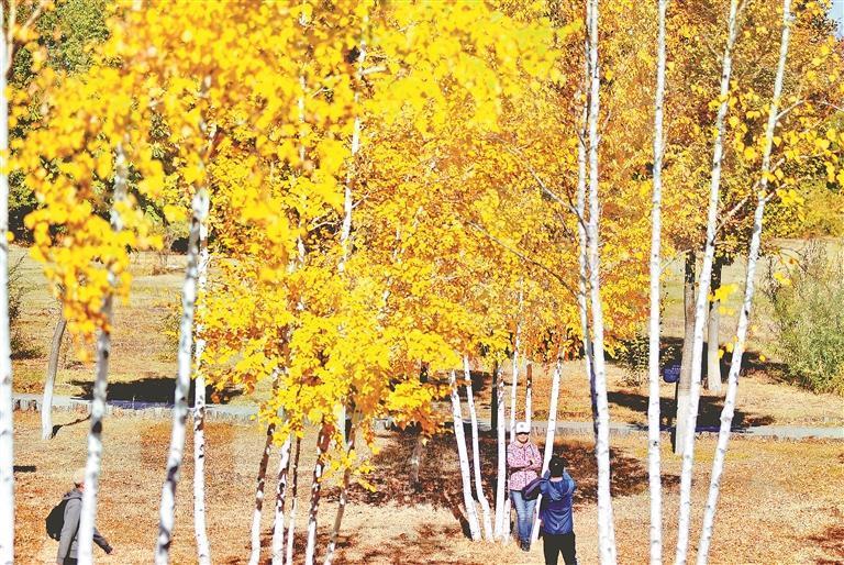 12日,哈爾濱市道里區(qū)麗江路附近的松花江畔,一小片白樺林吸引人們駐足觀賞、拍照。深秋的白樺樹,樹干筆直高聳,樹皮潔白如紙。枝頭的葉子已經(jīng)由綠色變成了金黃色,在陽光的照耀下,色彩濃重,景色迷人。本報記者 蘇強攝