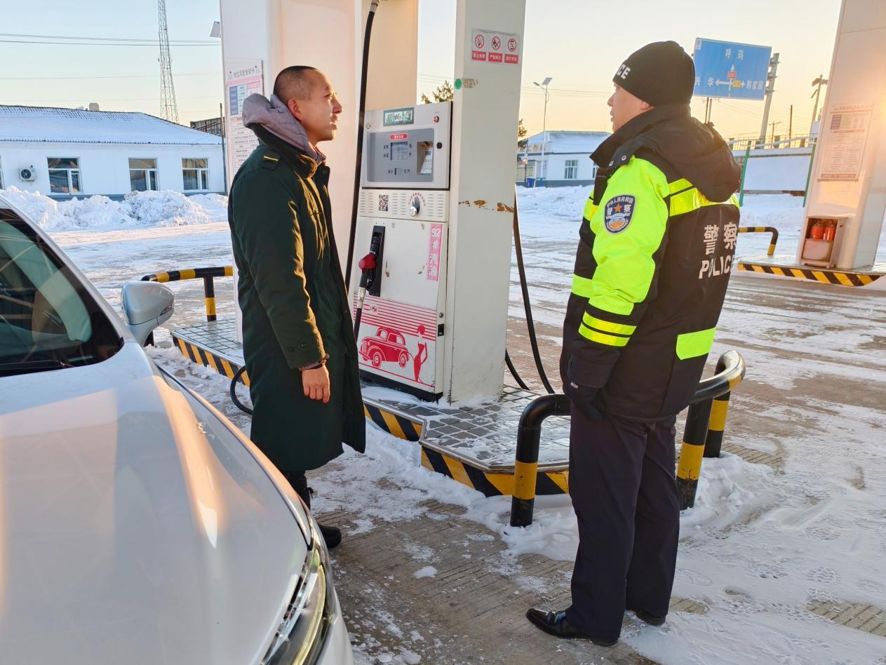 簡單確認(rèn)情況后,民輔警立即攜帶救援物資,前往事發(fā)地點,在最短時間內(nèi)找到報警人。在詢問車內(nèi)油量大約能達到最近的加油站后,警車引領(lǐng)報警人駕駛車輛抵達最近的加油站,加滿油后囑咐駕駛員雪天路滑,注意行駛速度,切勿疲勞駕駛。