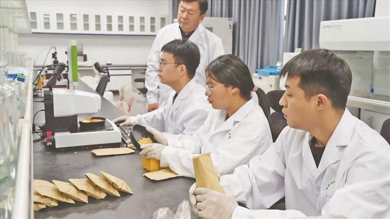 在國家現(xiàn)代農業(yè)產業(yè)園的實驗室,來自東北農業(yè)大學的研究生正在對大豆種子進行電腦數粒、離心分析密度等工作,為選育出高產、優(yōu)質、多抗的專用大豆品種提供基礎數據支撐。