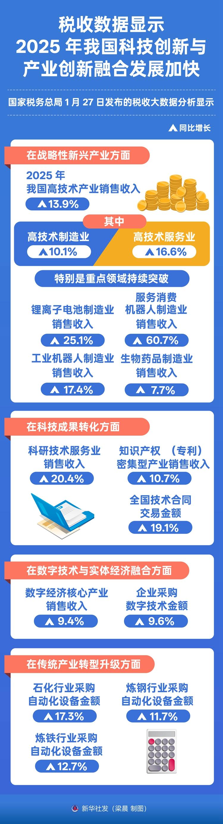 新華社北京1月27日電(記者劉開雄)國家稅務總局1月27日發(fā)布的稅收大數據分析顯示,2025年,我國科技創(chuàng)新與產業(yè)創(chuàng)新融合發(fā)展加快,戰(zhàn)略性新興產業(yè)茁壯成長,科技成果轉化力度持續(xù)提升,數字技術與實體經濟融合加深,傳統(tǒng)產業(yè)轉型升級加快。