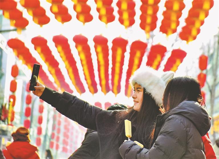 2月10日,北方小年,為迎接新春佳節(jié)的到來(lái),哈爾濱市道外區(qū)南三道街懸掛了近千盞紅燈籠,喜慶氣氛濃厚。在一排排大紅燈籠下面,有的游客在拍照,有的游客在觀賞風(fēng)景。