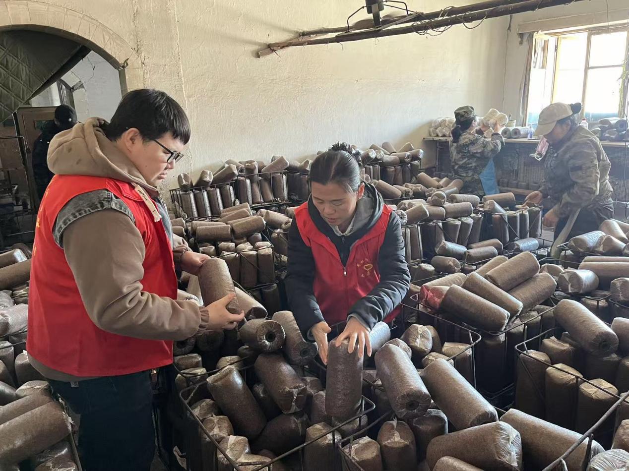 林場志愿者正在搬運(yùn)木耳菌袋(趙可心 攝)