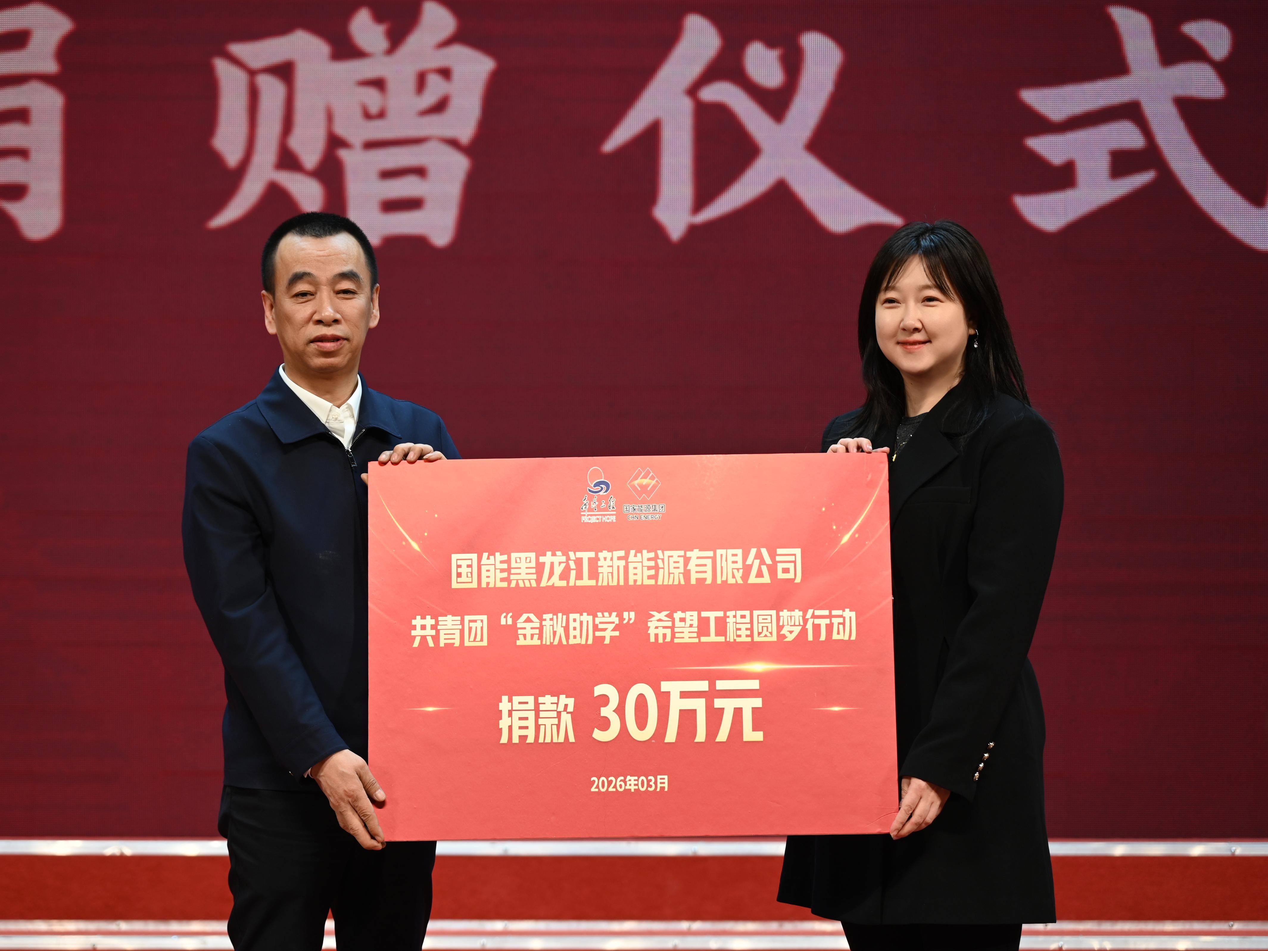 在捐贈(zèng)儀式上,國能黑龍江新能源有限公司向省青基會(huì)捐贈(zèng)共青團(tuán)“金秋助學(xué)”希望工程圓夢行動(dòng)助學(xué)金30萬元。其中,20萬元將專項(xiàng)用于資助全省13個(gè)市地、23所技工院校中品學(xué)兼優(yōu)、家庭經(jīng)濟(jì)困難的100名學(xué)生,為困境學(xué)子紓困解難,助力他們順利完成學(xué)業(yè)、掌握一技之長,憑借技能實(shí)現(xiàn)人生價(jià)值、圓人生夢想。