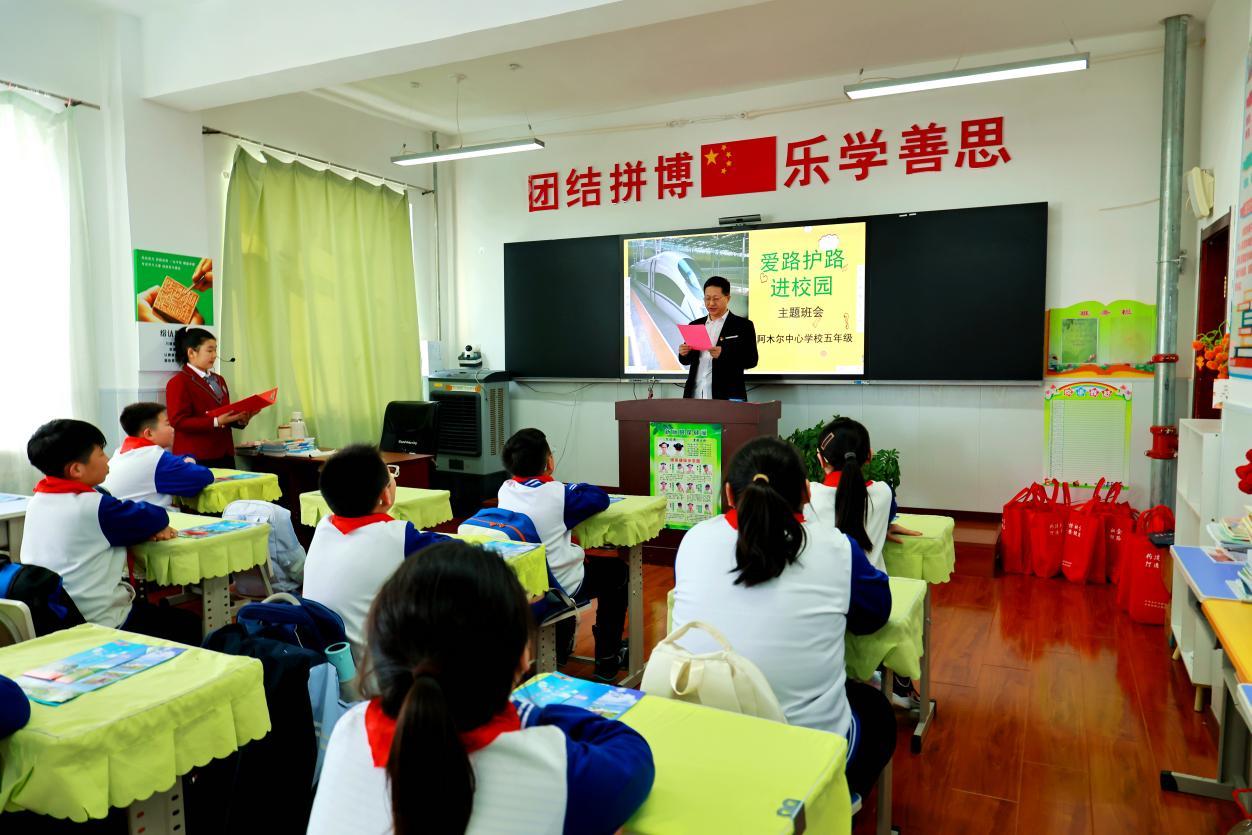 阿木爾向陽(yáng)派出所的干警與阿木爾林業(yè)局護(hù)路辦工作人員在向小學(xué)生講解愛(ài)護(hù)鐵路相關(guān)知識(shí)(王力 攝)