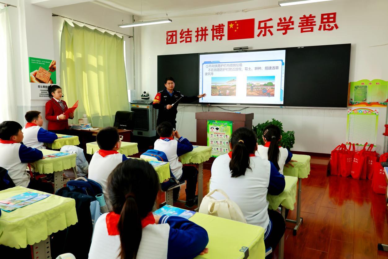 漠河站鐵路派出所的干警在向小學(xué)五年級(jí)學(xué)生講解鐵路安全注意事項(xiàng)(王力 攝)